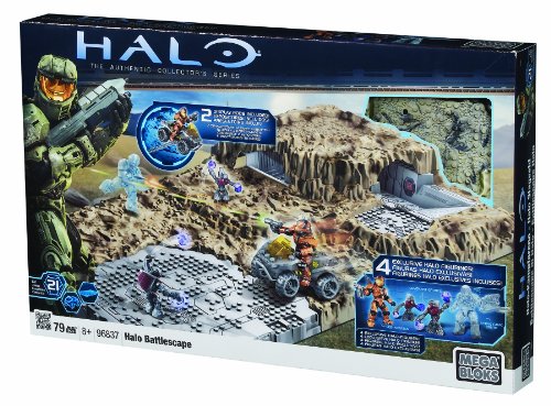 Establish your army, build and expand your battles like never before with the Halo Battlescape playset by Mega Bloks! The Halo Battlescape lets you build iconic battles on authentic war torn terrain for realistic skirmishes like never before! At the throttle of his UNSC Mongoose, the CQB Spartan rides over blasted dirt and rubble. But, unknown to him, two Grunts and an ?Active Camo? Brute have prepared an ambush for the Spartan. Made with interconnecting tiles to let you expand your scenario, you can join multiple Halo Battlescapes together to create even larger and more dynamic environments! Each Halo Battlescape includes durable pronged plates and two vehicle display rods to pose your forces however you want! Go inside the Outpost and open the roof to command firefights between enemy forces or go outside and declare all out war with UNSC and Covenant units! Choose your side, build the battle and display the victor! Ideal for children ages 8 and up!