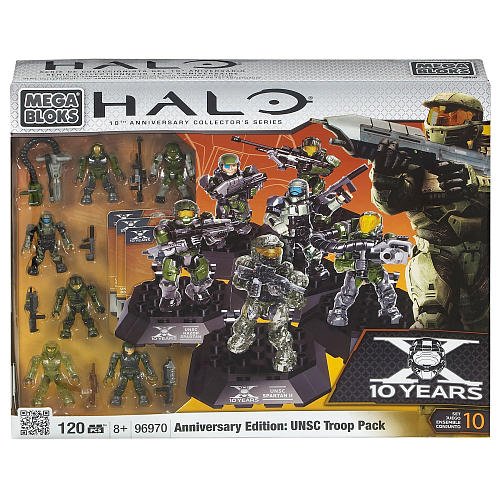Celebrate 10 years of Halo by collecting the iconic troops from across the Halo universe with the Mega Bloks Halo 10th Anniversary UNSC Troop Pack (96970)! Lead your UNSC forces into battle with the Green Spartan Mark IV in Camo Mode, UNSC Marine, CQB Spartan, Orbital Drop Shock Trooper, Flame Marine and Hazop Spartan!The Mega Bloks Halo 10th Anniversary UNSC Troop Pack (96970) features Build, play and display! Original iconic heroes from the Halo Universe with weapons! Special foil collectors cards detailing each heros role in the HumanCovenant war! Collect all 10th Anniversary Edition toys!RelateItems