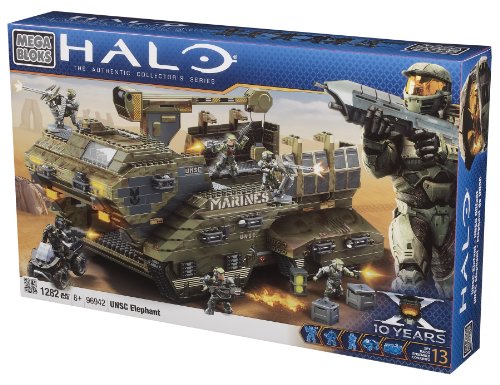 The massive Mega Bloks Halo UNSC Elephant 96942 roars onto the battlefield as the ultimate mobile command center. A Recon Spartan, cloaked in steathy black body armor, scouts the surroundingarea, ensuring the Elephant finds the optimum position to deploy its forces taking the fight to the Covenant. This buildable set includes a working repair crane and manual deployment ramp, 3 LAAV Machine Guns, new Black Recon Armor Spartan micro action figures, six UNSC Marines and buildable UNSC Mongoose.RelateItems